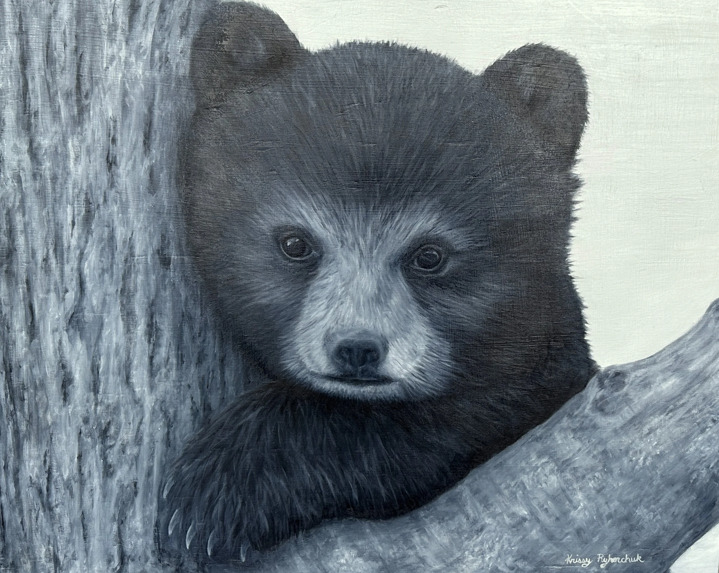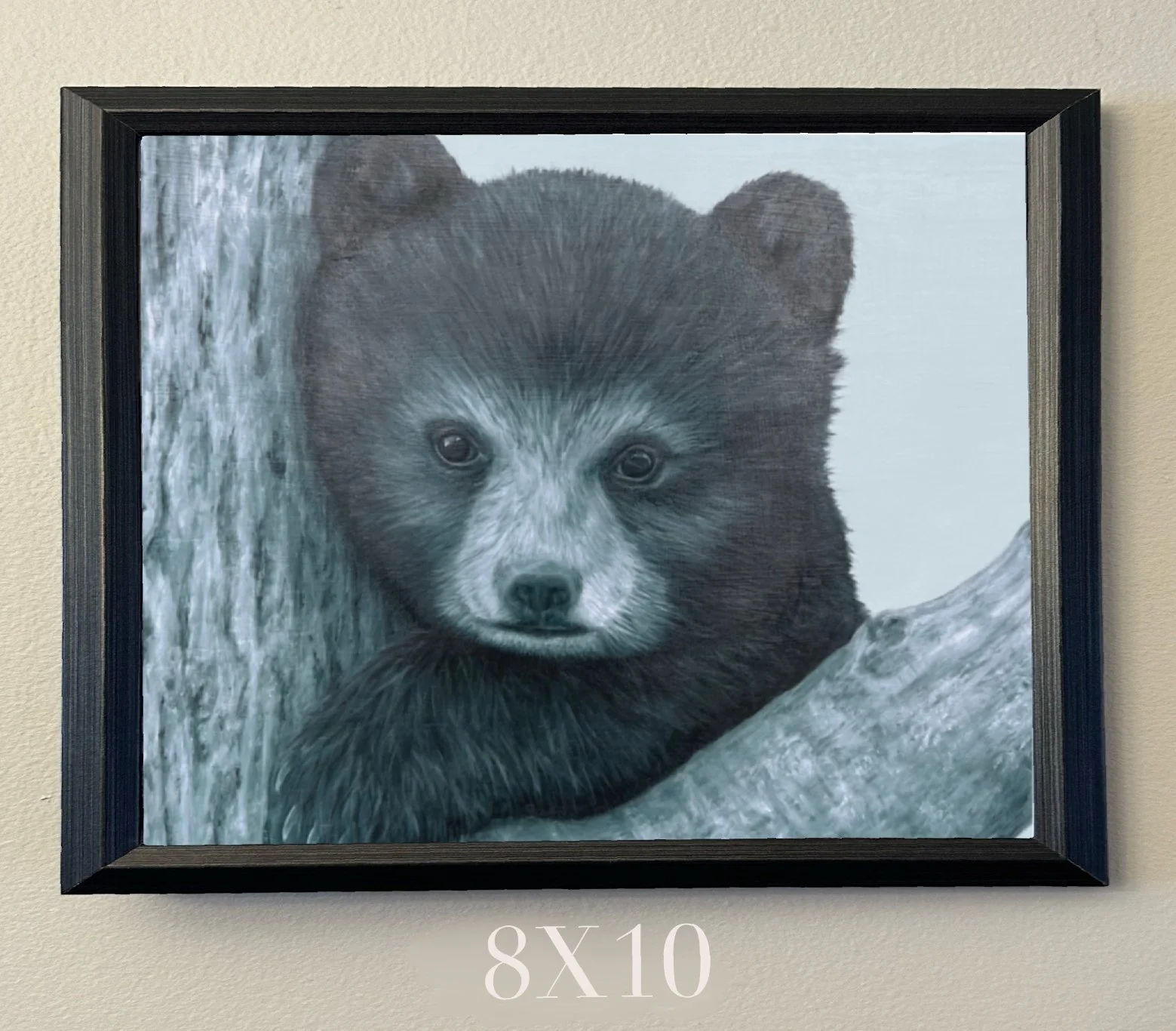 Sweet black bear cub hanging out in a tree. Painted using only 2 colours.