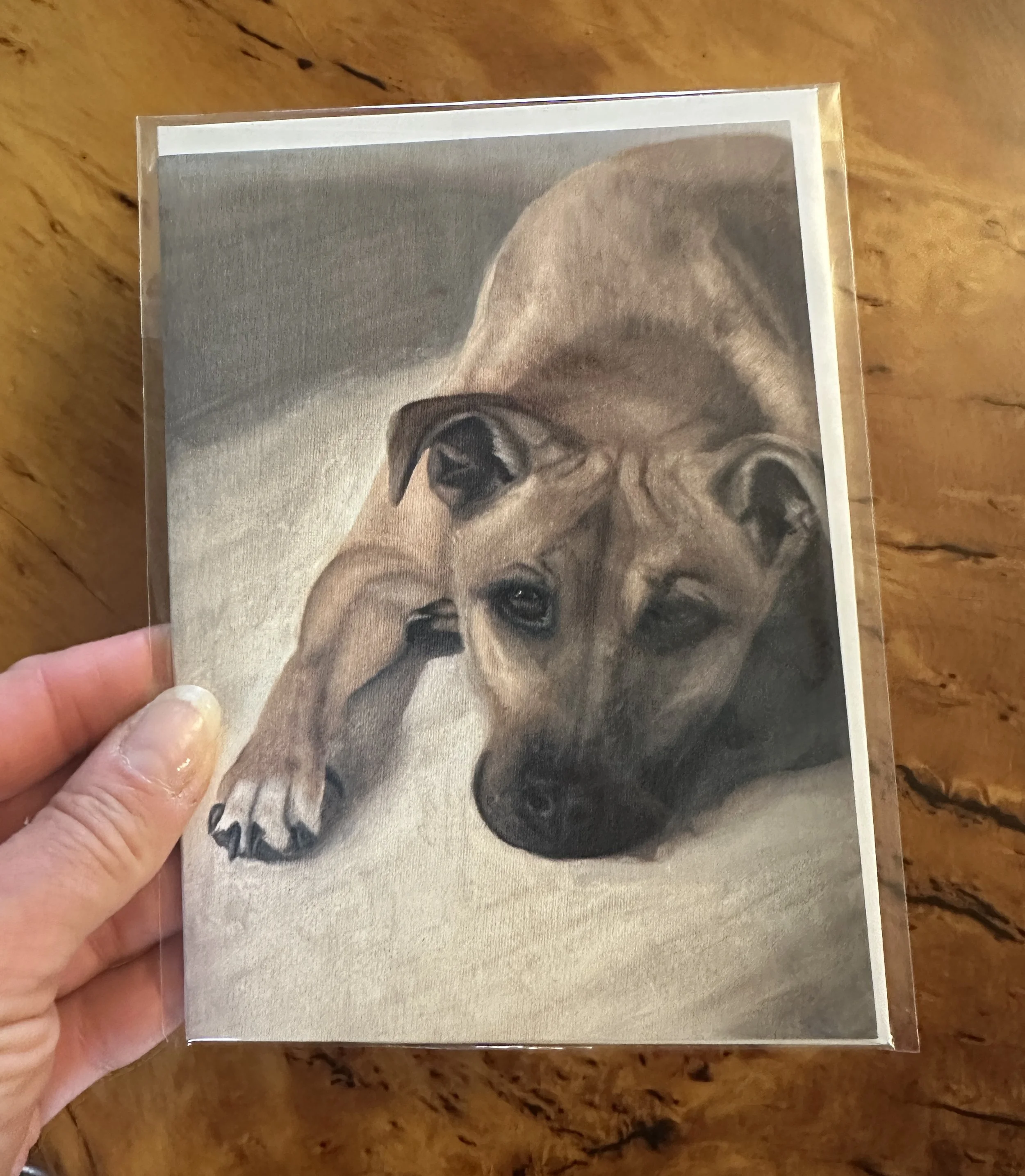 These hand produced greeting cards are printed replicas of original oil paintings by Canadian artist, Krissy Ryhorchuk. Cards are blank inside, and have a small, subtle stamp indicating the painting's title on the backside. Your card, together with an A6 sized, white envelope will be individually sealed in a transparent sleeve. Great for any occasion… a birthday gift, a thank you card, or a special note to a friend or family member. It's a perfect gift for any dog lover.