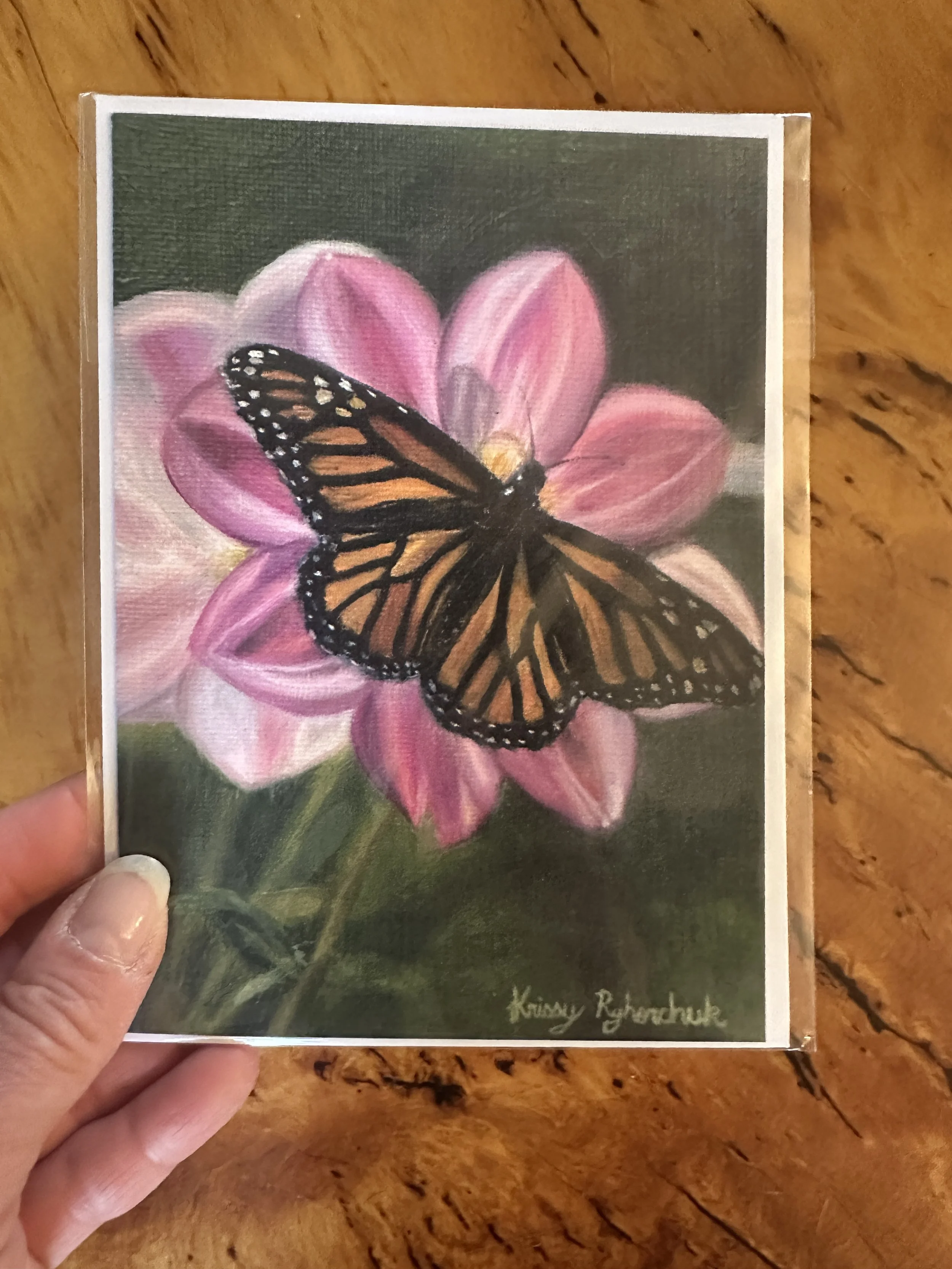 These hand produced greeting cards are printed replicas of original oil paintings by Canadian artist, Krissy Ryhorchuk. Cards are blank inside, and have a small, subtle stamp indicating the painting's title on the backside. Your card, together with an A6 sized, white envelope will be individually sealed in a transparent sleeve. Great for any occasion… a birthday gift, a thank you card, or a special note to a friend or family member. It's a perfect gift for any nature lover or butterfly far.