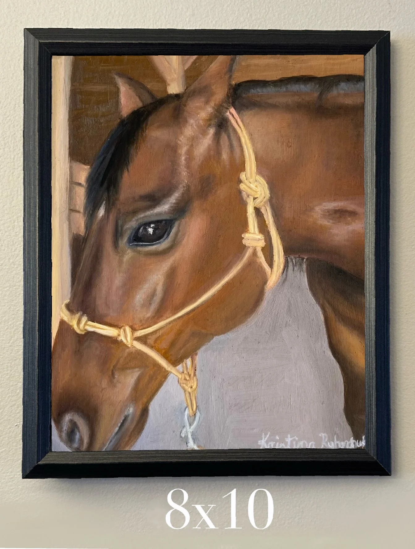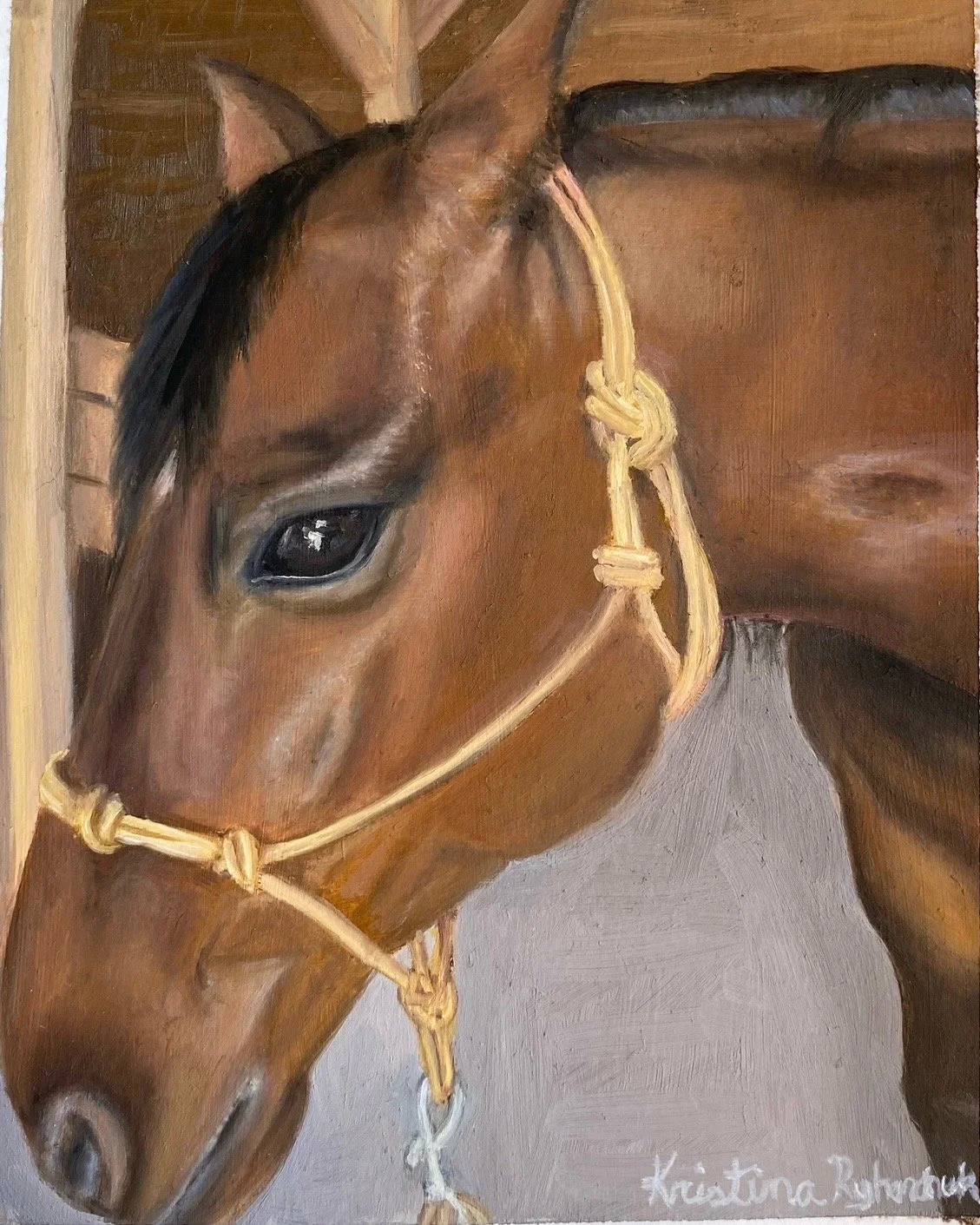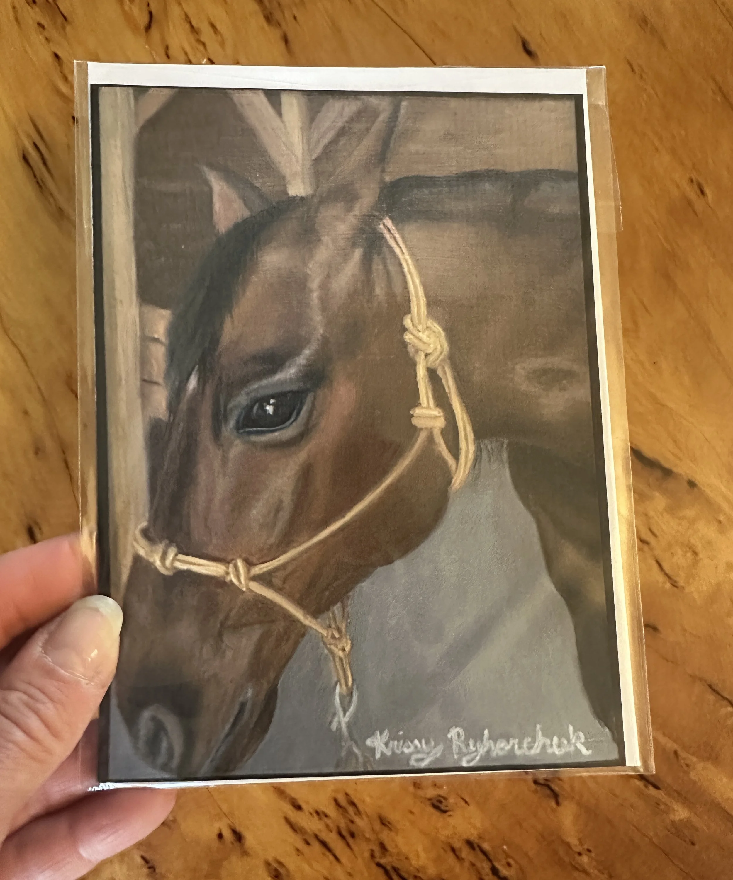 These hand produced greeting cards are printed replicas of original oil paintings by Canadian artist, Krissy Ryhorchuk. Cards are blank inside, and have a small, subtle stamp indicating the painting's title on the backside. Your card, together with an A6 sized, white envelope will be individually sealed in a transparent sleeve. Great for any occasion… a birthday gift, a thank you card, or a special note to a friend or family member. It's a perfect gift for any horse or animal lover.