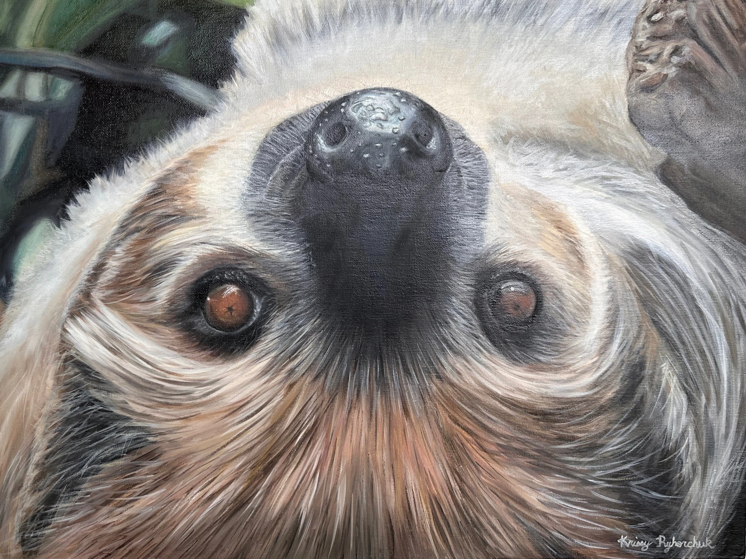 This Cute little sloth is hanging curiously upside down and seems like he’s looking right at you!